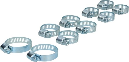 Slangklemmen set met 10 slangklemmen met schroef voor het klemvast schroeven van waterslangen en flexibele luchtafvoerkanalen. Gemaakt van roestvrij staal, dus zeer goed bestand tegen vocht. Sluit perfect aan op de slang door gladde binnenkant. 3 verschillende formaten. De grootste klemradius is 32 mm. De kleinste klemradius is 8 mm. De klemmen zijn eenvoudig vast te maken en voorkomen schade aan de waterslang.