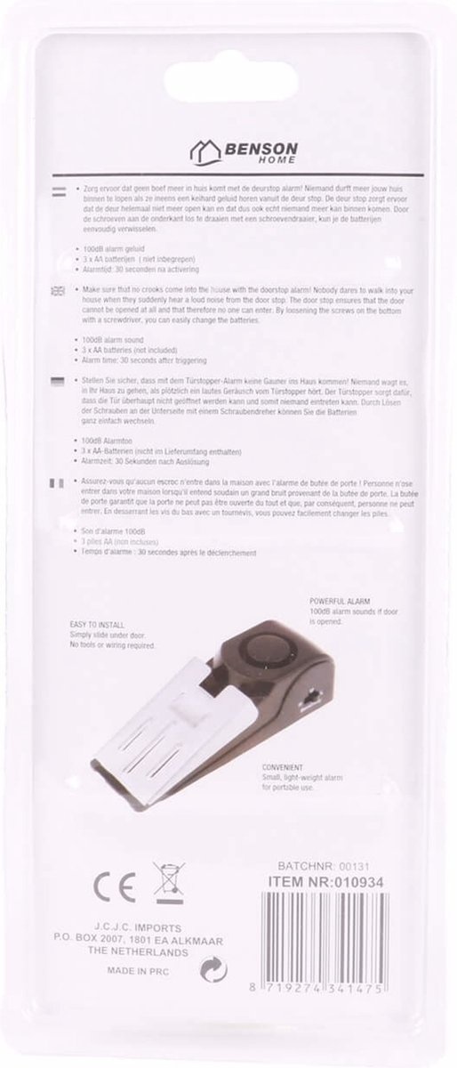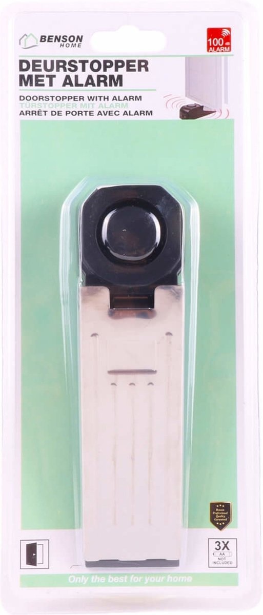 Zoekwoorden: Benson Deurstopper, Deurwig met Alarm, Deurstop Alarm, Veiligheid, Huisbeveiliging, Inbraakpreventie, Alarmsysteem, 100 dB, Antislip Bodem, Geen Installatie, AAA Batterijen.