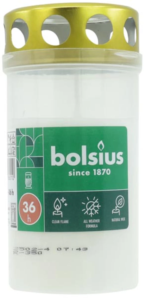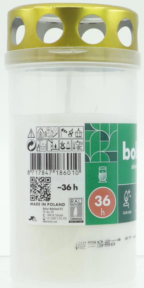 Mooie kunststof grafkaars met een metalen deksel. 36 branduren.