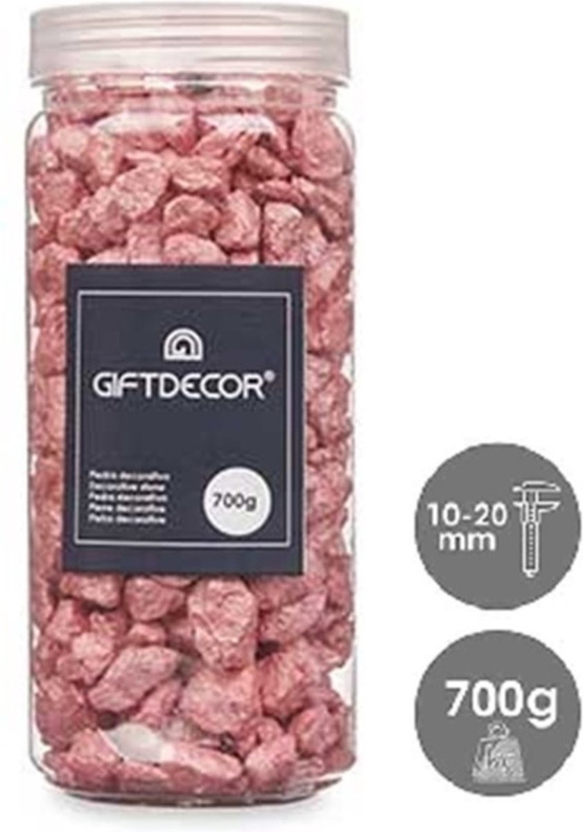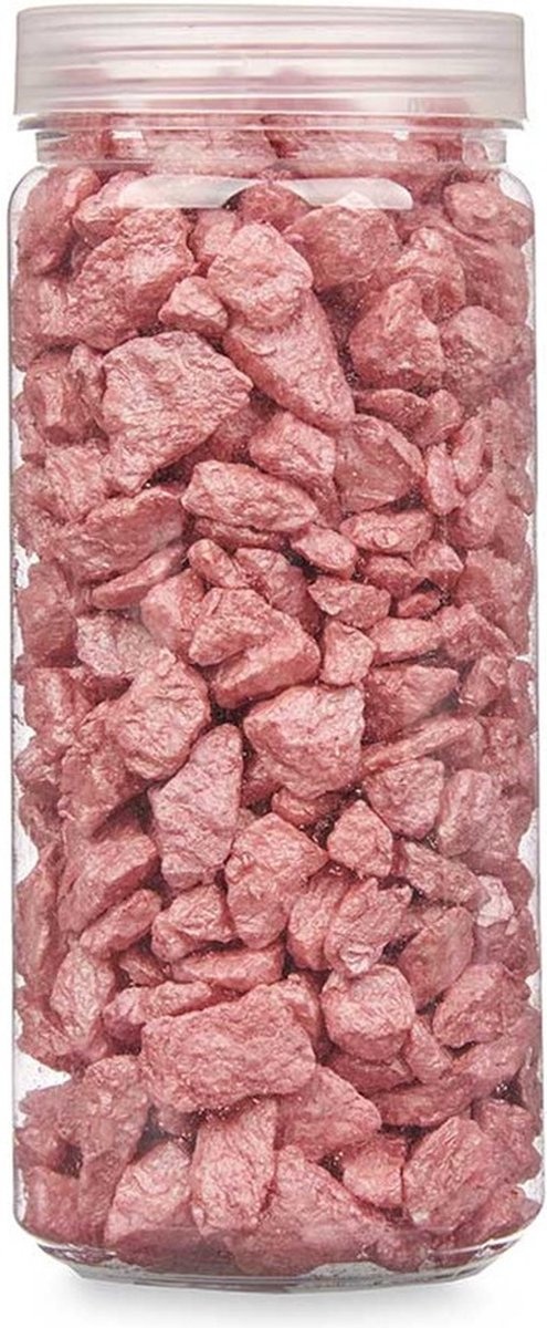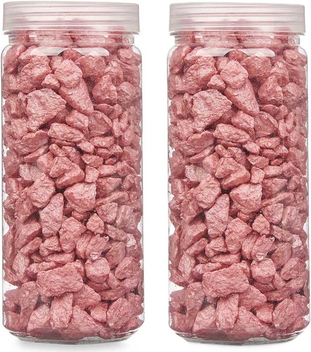 Decoratie stenen/steentjes/kiezels in de kleur roze. Klein formaat steentjes van ongeveer 10-200 mm. 2x Potje gevuld met kleine kiezels. Te gebruiken als bodembedekking voor in het aquarium of ter decoratie in een bloemenvaas of plantenbak. Formaat potje: 6 x 15 cm. Inhoud per potje: 700 gram. Materiaal: kunststeen. Vulmateriaal.