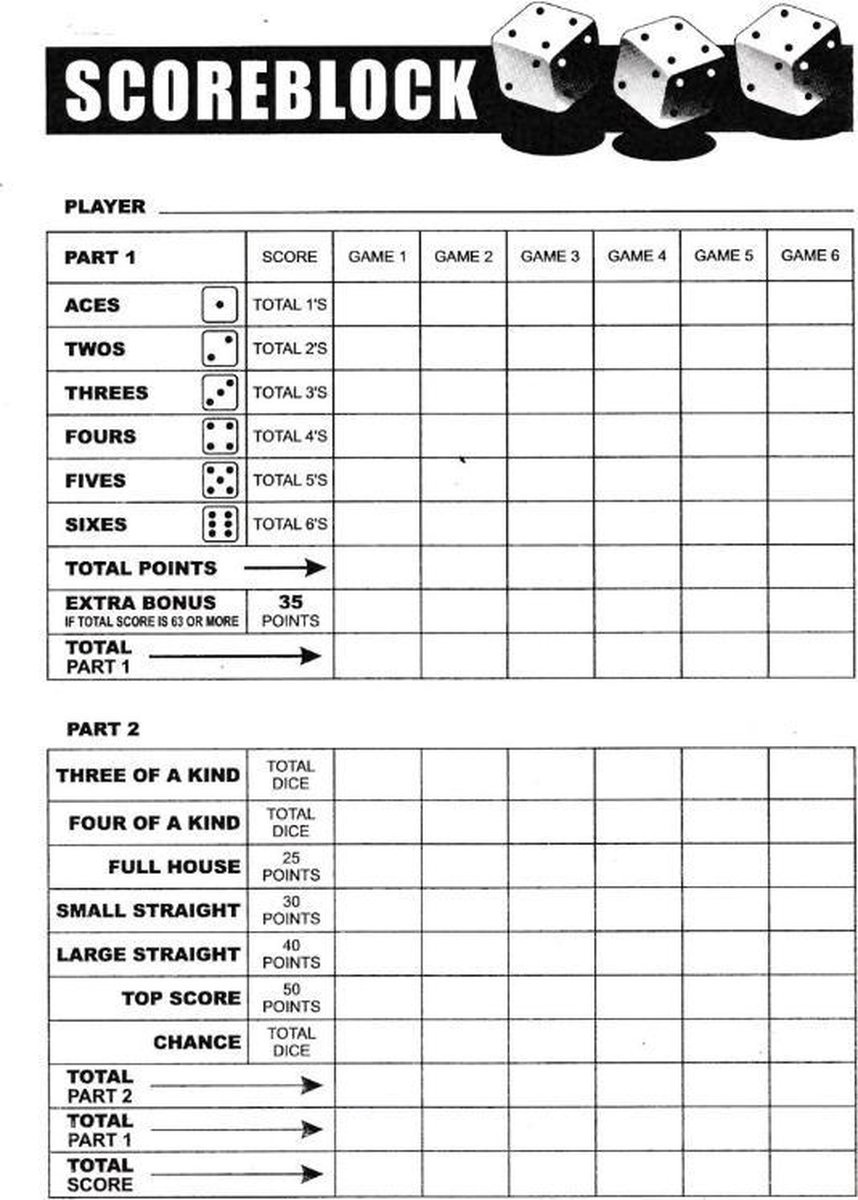 Scoreblok ten behoeve van het spel yahtzee. 100 vellen. Geschikt voor kinderen vanaf 8 jaar.