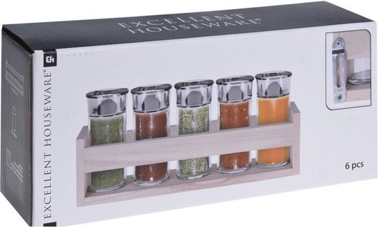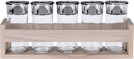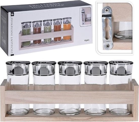 Houten kruidenrek met 5 glazen potten. De glazenpotten kunnen afzonderlijk bijgevuld worden en bevatten een grove en fijne opening voor een precieze dosering. Het kruidenrek kan makkelijk opgehangen worden doormiddel van een handig ophangmechanisme maar kan ook gewoon neergezet worden. Afmeting rek inclusief glazenpotten: ca. 26 x 5.5 x 11 cm. Afmeting glazenpotten: ca. 4.5 x 10 cm.