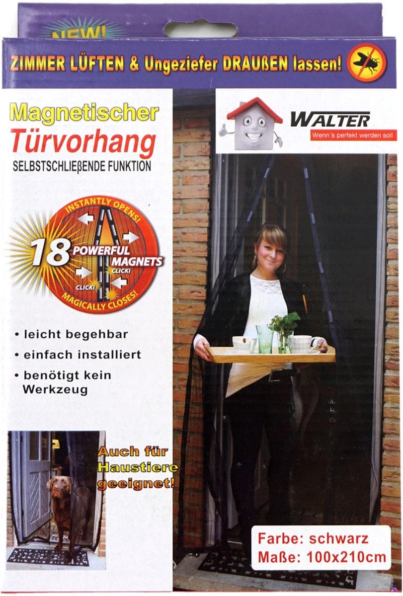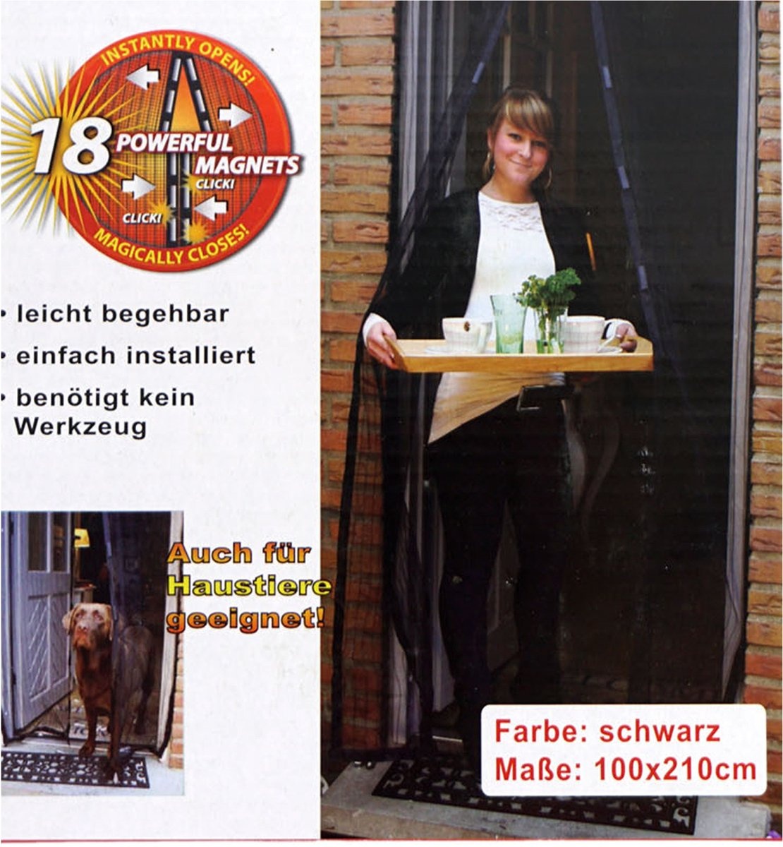Insecten deurhor/gordijn, in de kleur zwart. De hor bestaat uit 2 delen, welke magnetisch automatisch sluiten. U kunt de hor-delen makkelijk bevestigen aan uw kozijn door de bijgeleverde plakkers en/of de pinnen. Materiaal: polyester. Totale afmeting: ca. 100 x 210 cm. Insecten werende deur- en raamhorren.