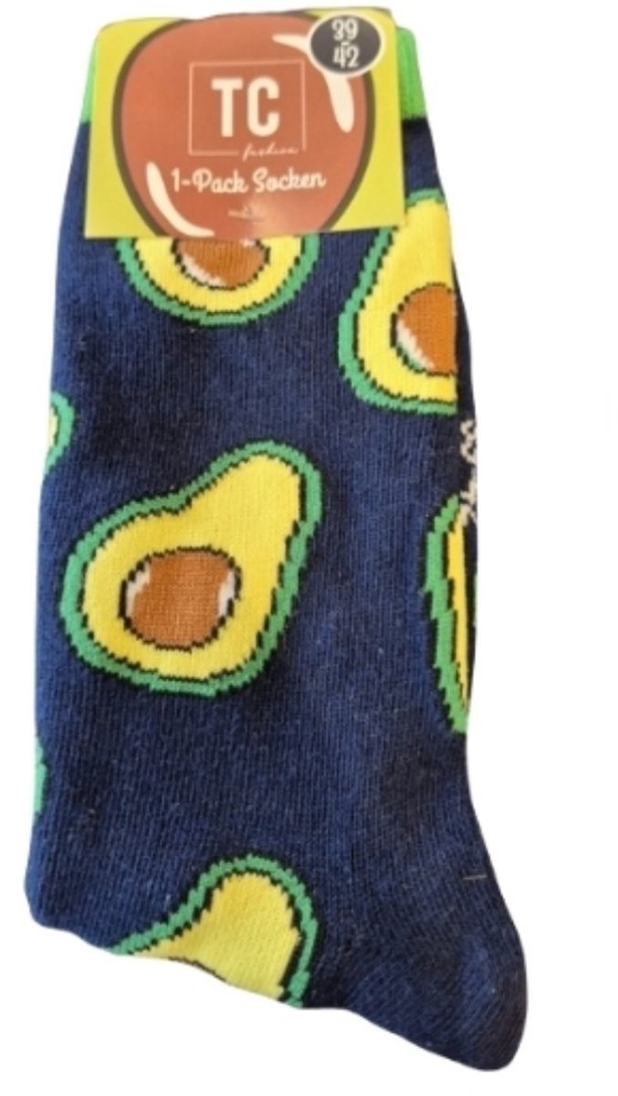 Deze set bestaat uit drie paar sokken met vrolijke print. Ze zijn donkerblauw met geel, groene avocado. De sokken hebben een universele maat en zijn geschikt voor schoenmaten 35-38.