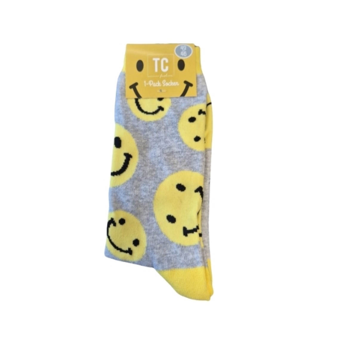 Deze set bestaat uit drie paar sokken met vrolijke smileys. Ze zijn grijs met gele smileys. De sokken hebben een universele maat en zijn geschikt voor schoenmaten 43-46.