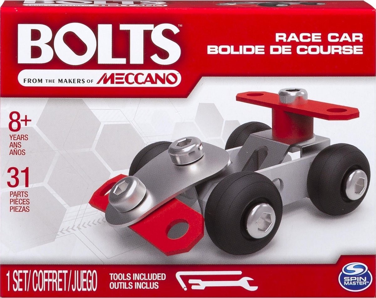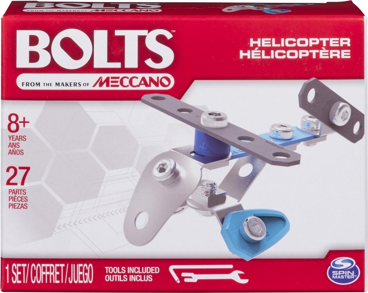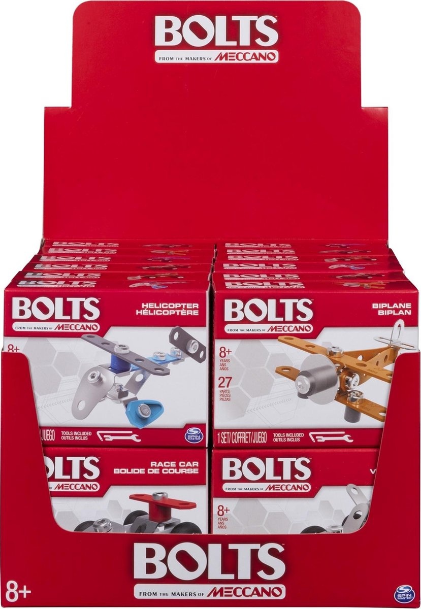 Deze mini startersets zijn ideaal om de bouwer in jezelf te ontdekken. Iedere Meccano Bolts set is inclusief verschillende metalen onderdelen en twee gereedschappen. Erg leuk als set of om weg te geven als kleine cadeautjes, elk set of voertuig is apart verpakt en komt met zijn eigen setje gereedschap.