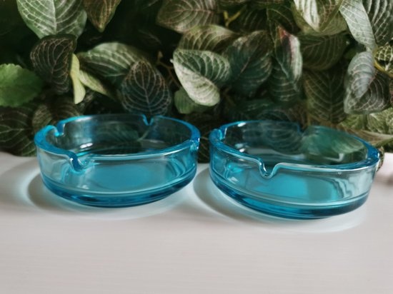 Set van 2 glazen transparante blauwe asbakken retro stijl, zeer stevig dik glas en een hoge rand van 3 cm om de as op zijn plaats te houden