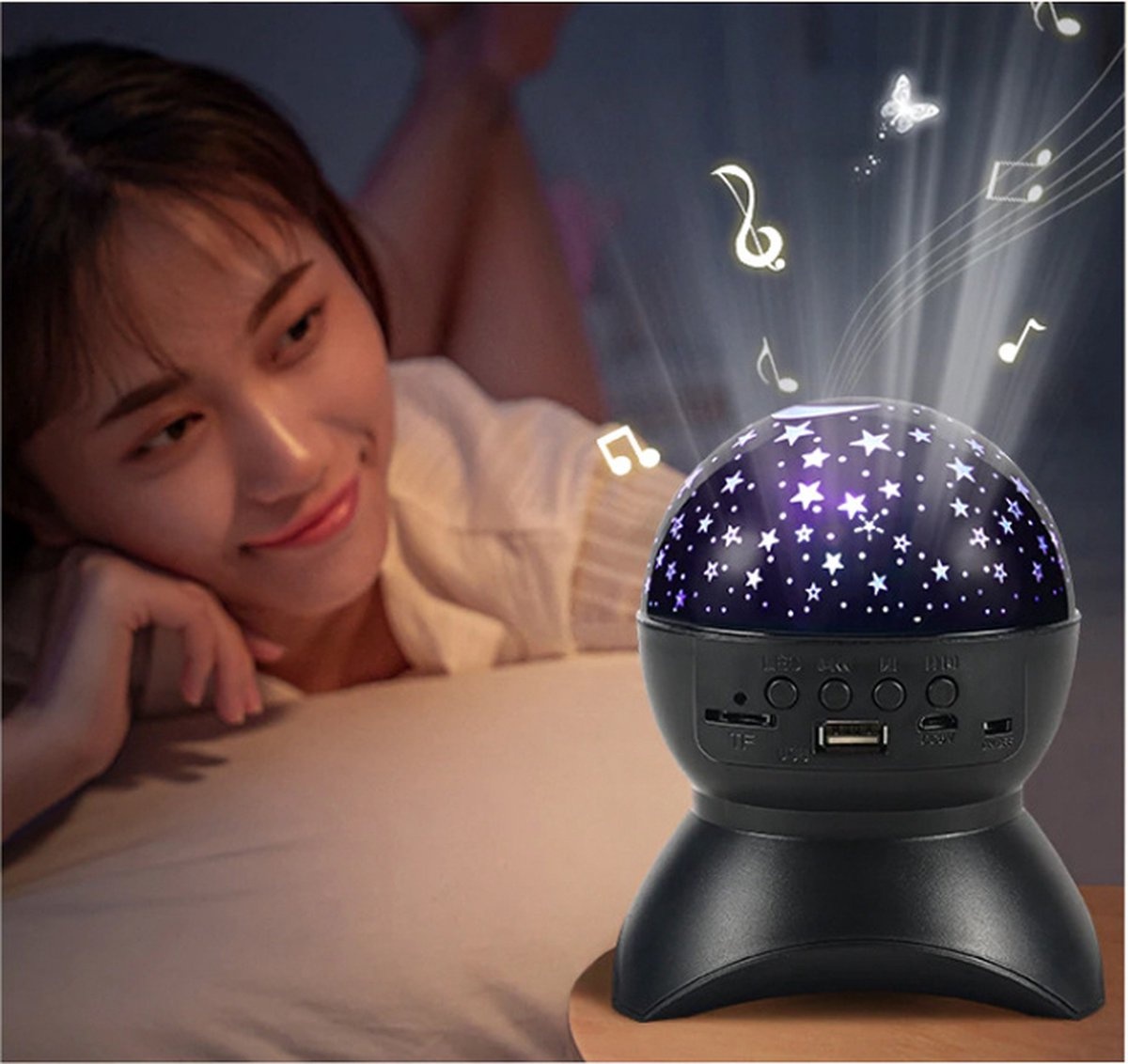 De projector heeft een ingang voor een micro SD-kaart, USB, DC 5V oplaadingang en bluetooth. U kan dus muziek afspelen vanaf zowel onze flashdrive als muziek vanaf de telefoon. De luidspreker in dit kleine apparaat is erg luid. Het apparaat is perfect voor kleine kinderen, die tijdens het spelen van hun favoriete slaapliedje of een verhaaltje voor het slapengaan naar een prachtige sterrenhemel kunnen kijken